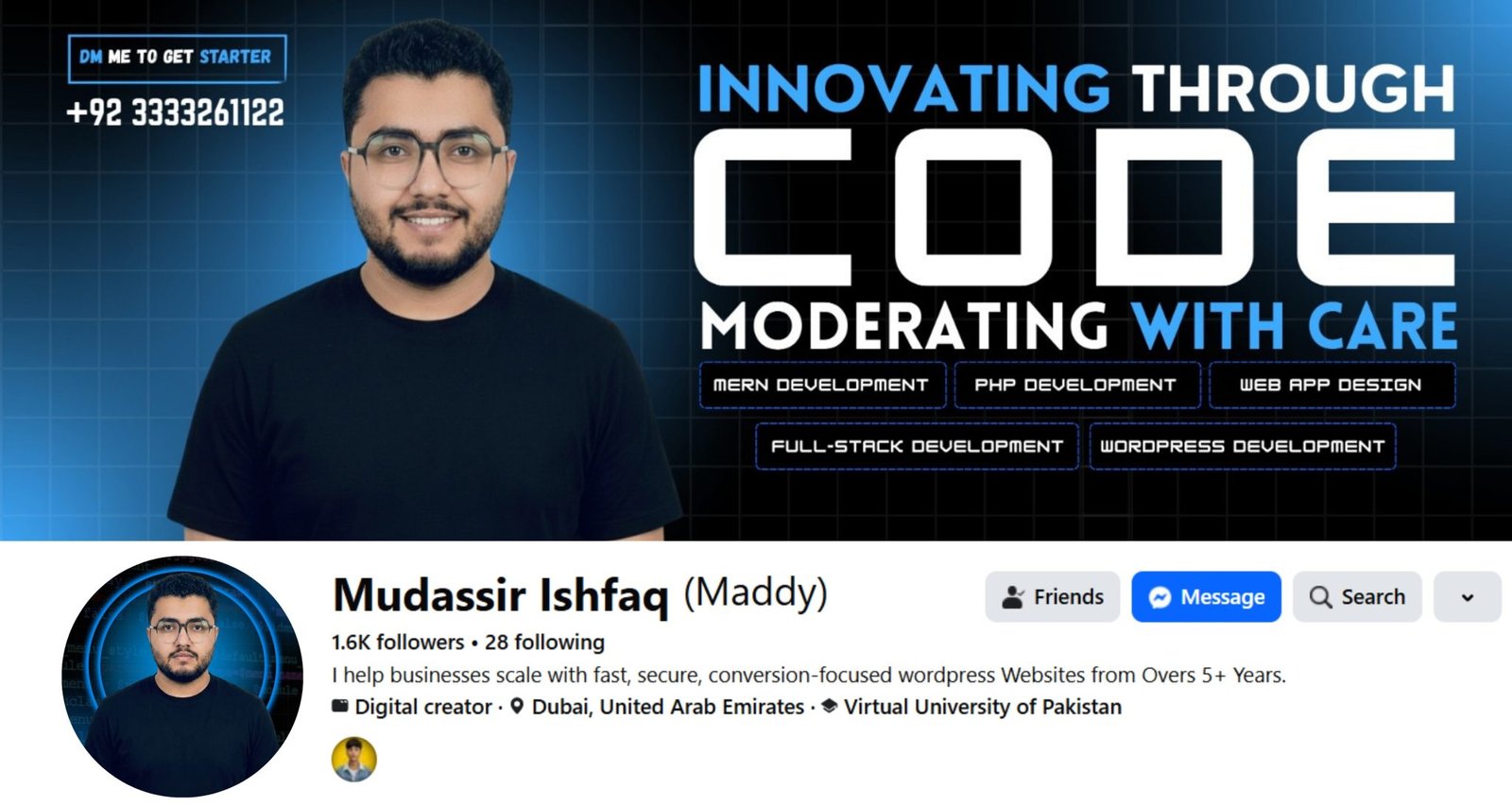 Mudassir Ishfaq is a professional Web Developer specializing in creating modern, responsive, and high-performance websites. We revamped his Facebook profile to build a strong personal brand, improve online visibility, and showcase his professional identity. The revamp included a custom banner, a branded profile picture, and 3 pinned posts, all designed with a Sky Blue, Black, and White color scheme to ensure a cohesive and professional look. This profile design enhances credibility, strengthens personal branding, and attracts potential clients searching for web development services.